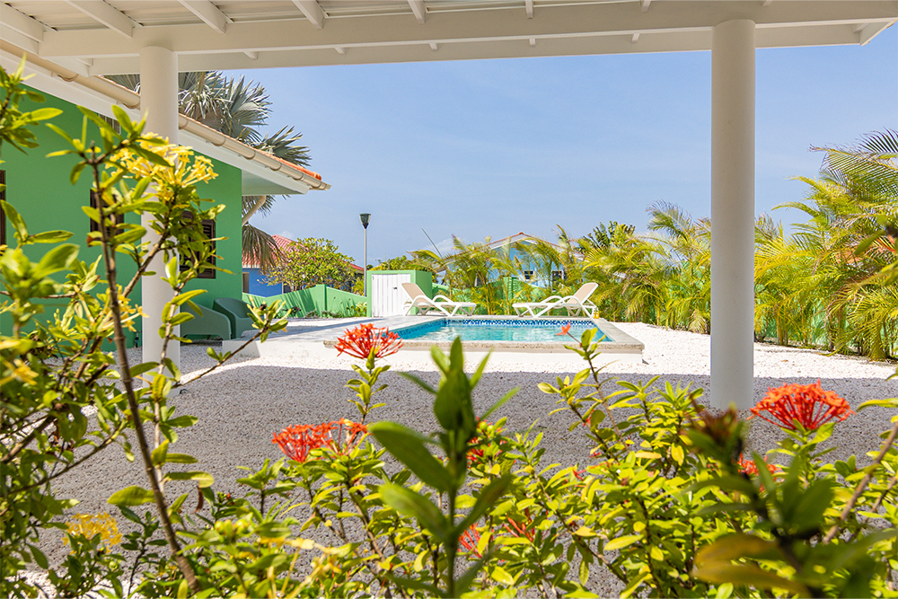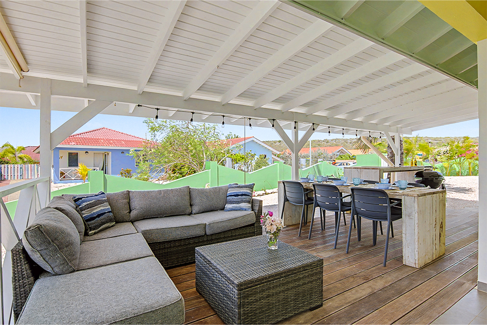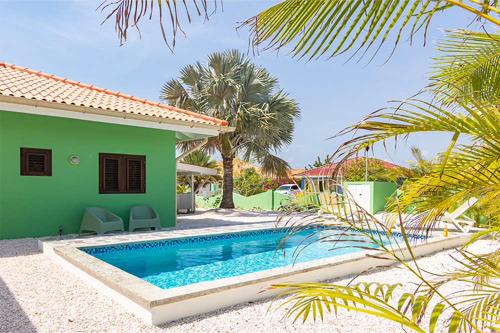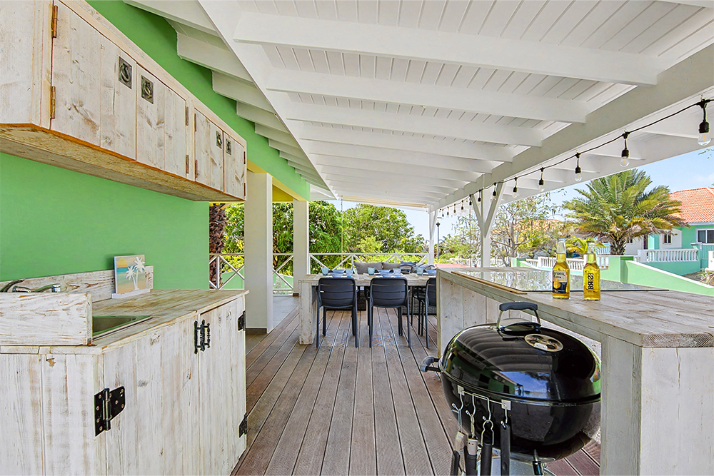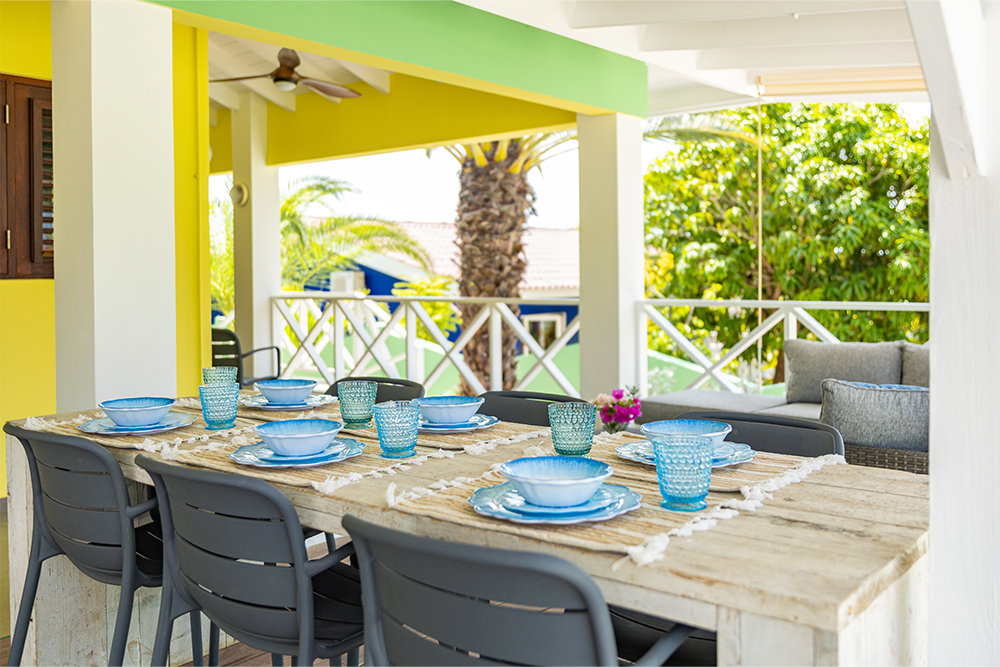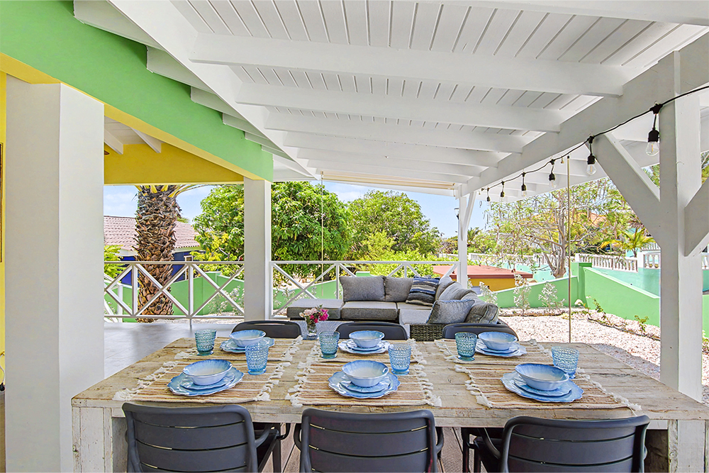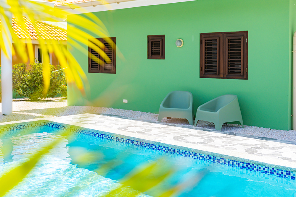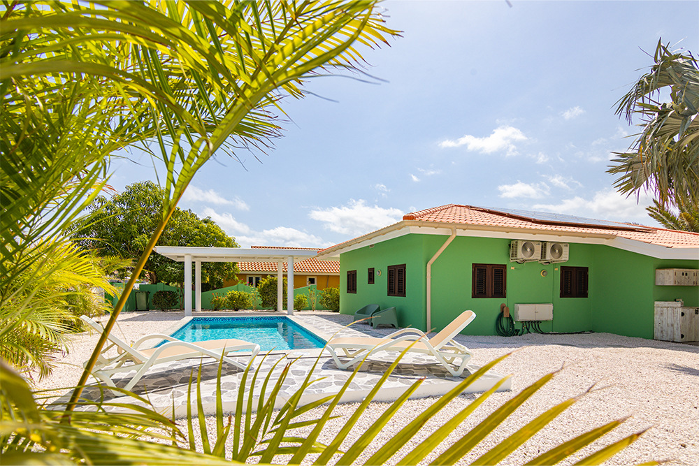 Villa Hofi Berde heeft een eigen, warme uitstraling die perfect past bij het Curaçaose buitenleven. De groene gevel, houten shutters en de royale porch rondom het huis zorgen voor een ontspannen Caribische sfeer.