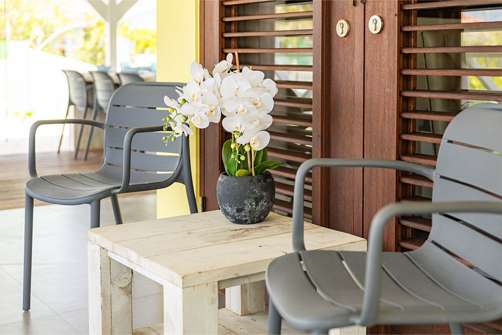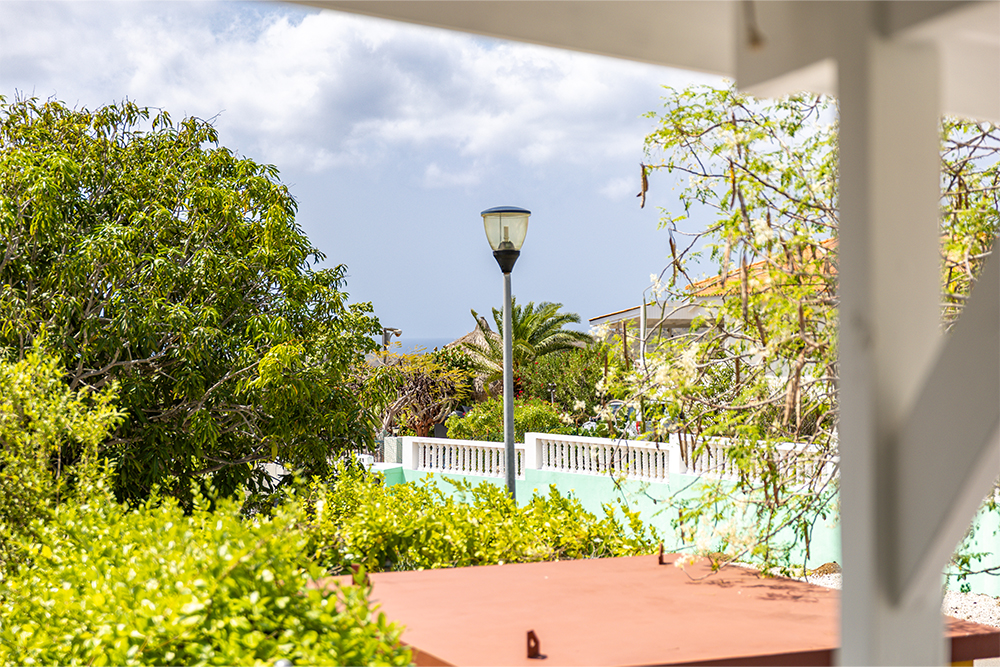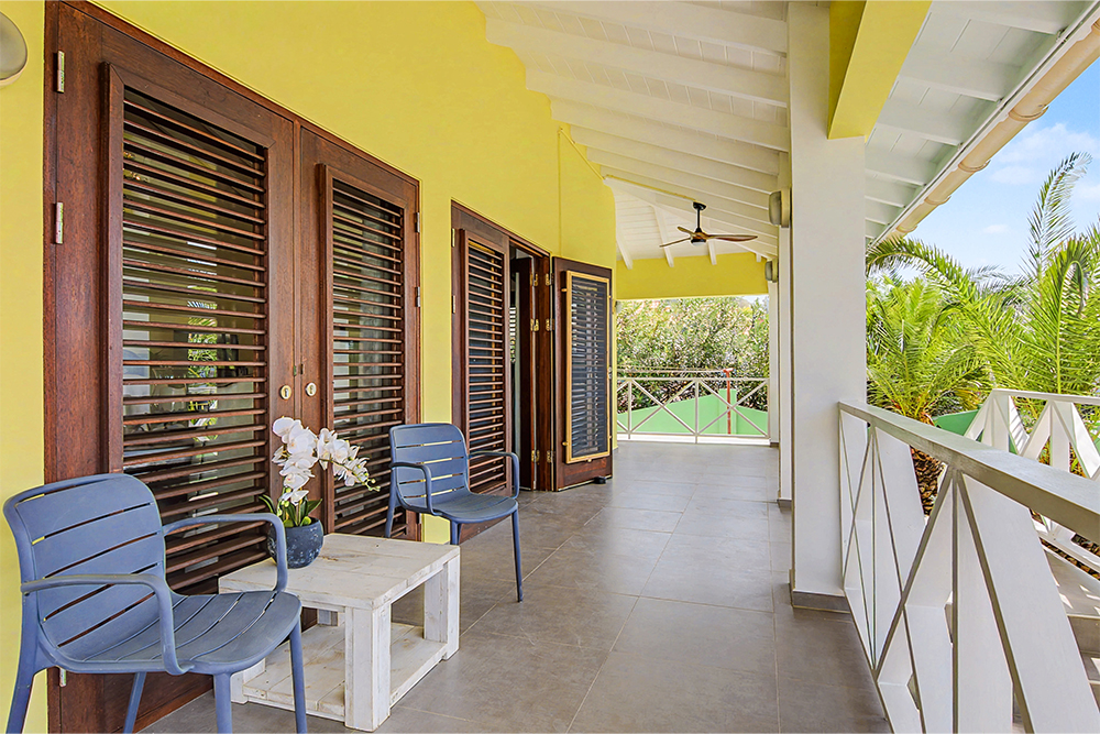 De houten shutters zorgen voor natuurlijke ventilatie, privacy en die typische Curaçaose sfeer — van ’s ochtends vroeg tot in de avond met een drankje op de porch.