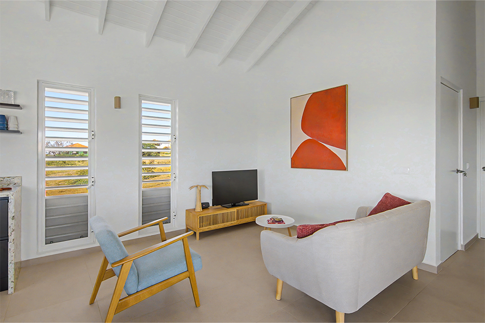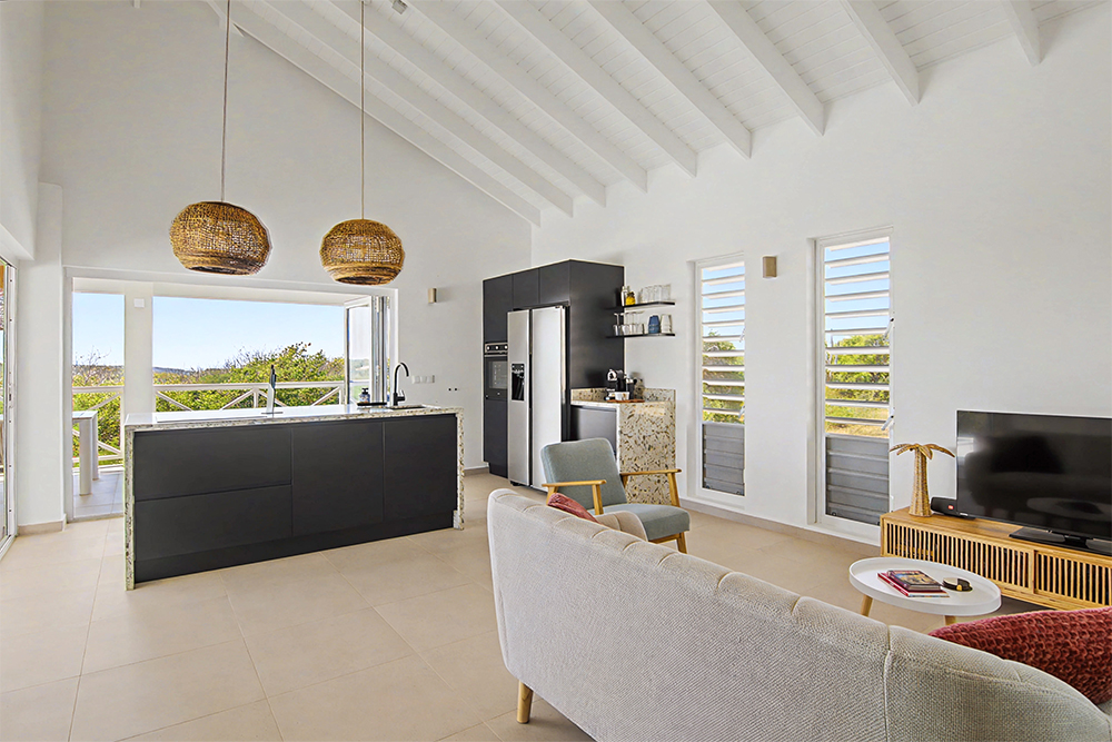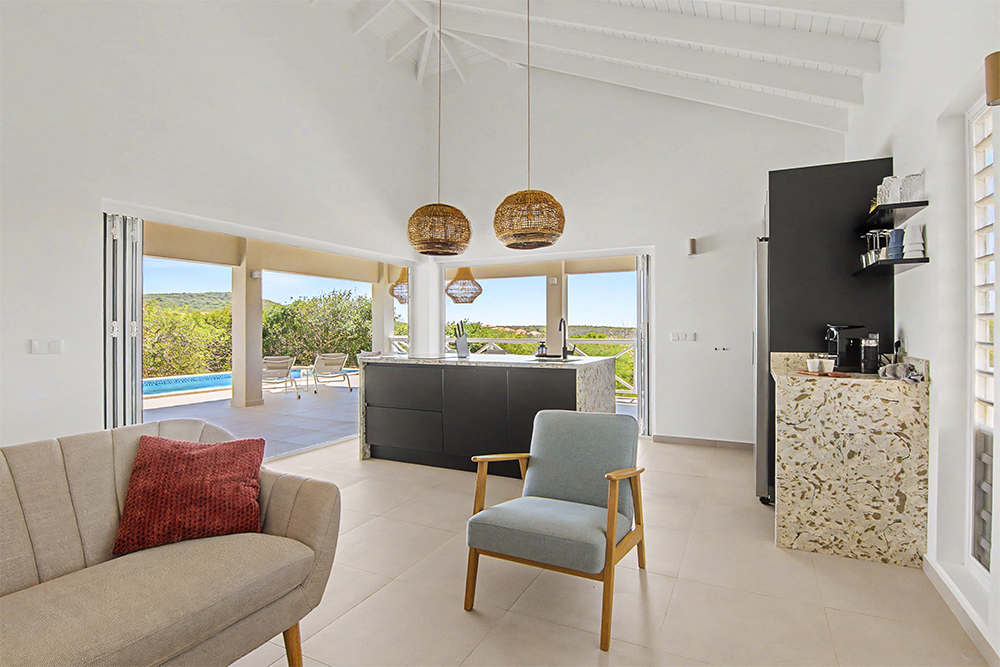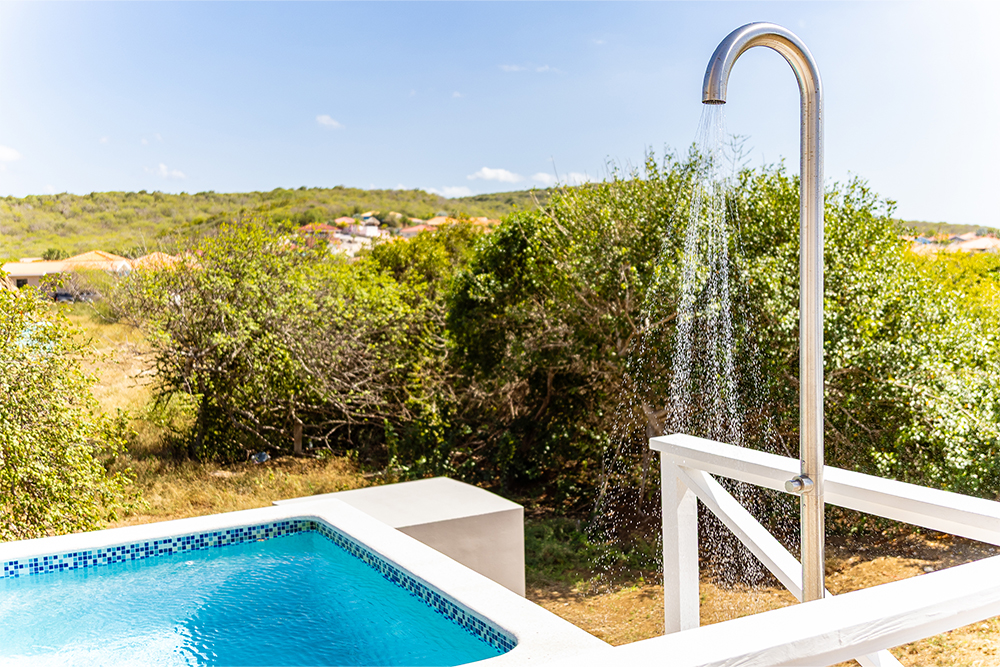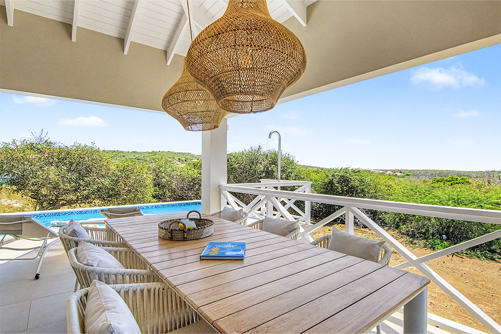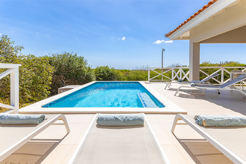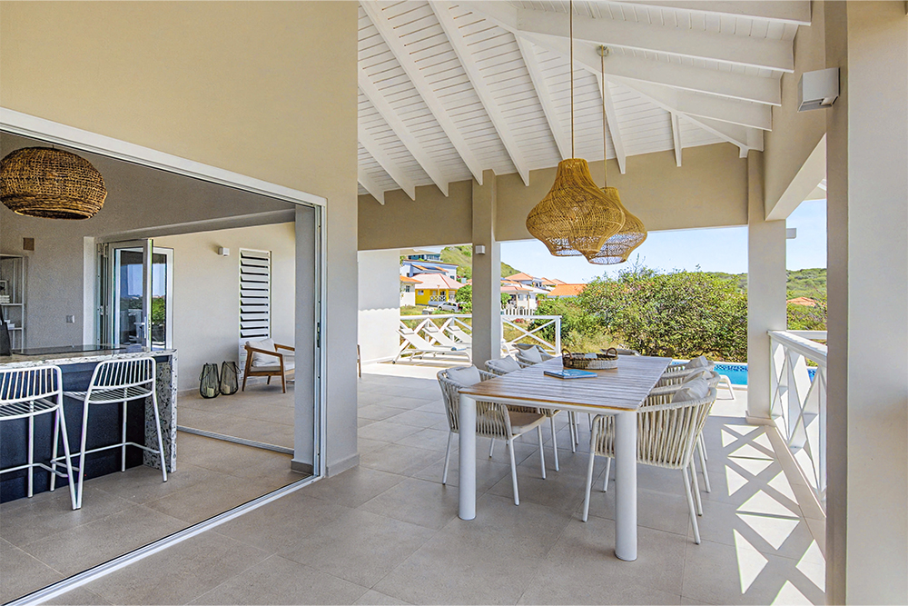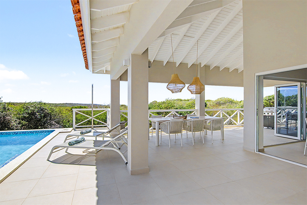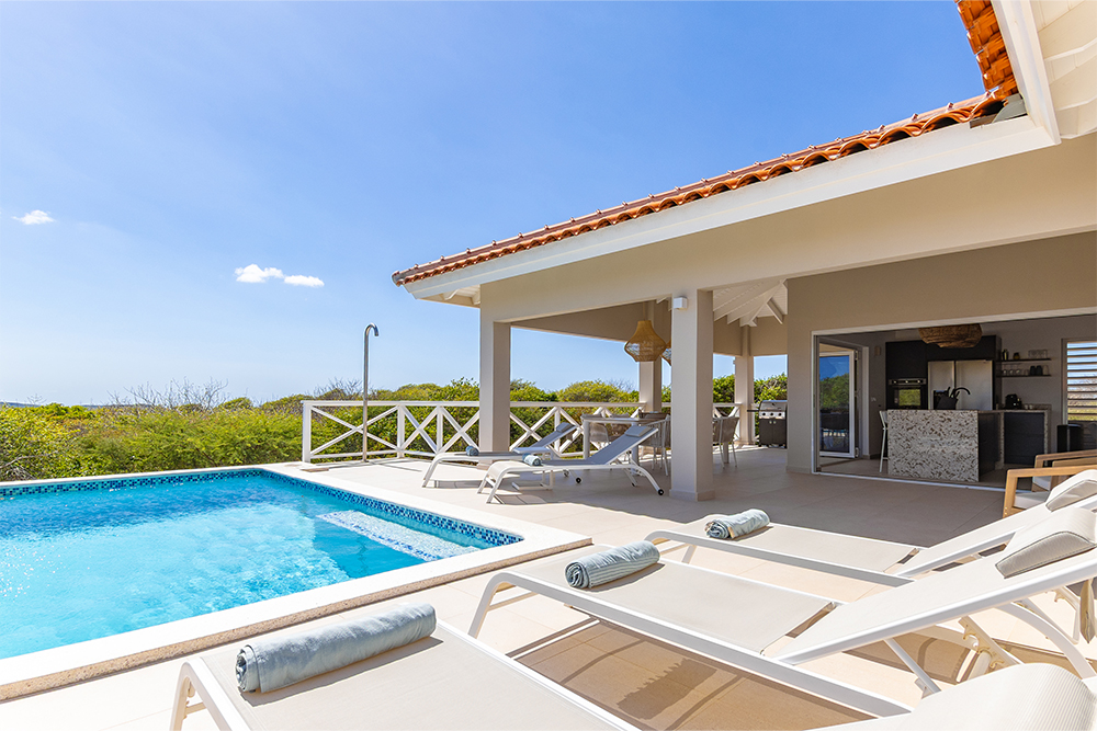 Via de grote schuifpuien loopt u zo naar het royale, overdekte terras met lounge- en eethoek. Geniet van de verkoelende passaatwind, het tropische uitzicht en het ultieme vakantiegevoel. Het privézwembad maakt het plaatje compleet — ideaal voor een verfrissende duik op elk moment van de dag.