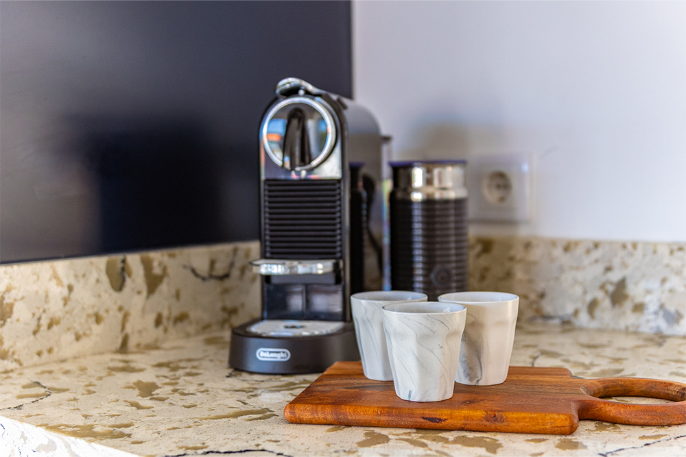 De ruime open keuken met kookeiland is een echte eyecatcher — perfect om samen te koken en gezellig te tafelen. De koffiecorner is uitgerust met een Nespresso-apparaat met melkopschuimer. Daarnaast is er een losse keukenmixer/blender aanwezig, ideaal voor het maken van smoothies met groente en fruit. De koelkast is voorzien van een ijsblokjesmachine die is aangesloten op de waterleiding: altijd verse ijsblokjes voor uw drankje in de zon.