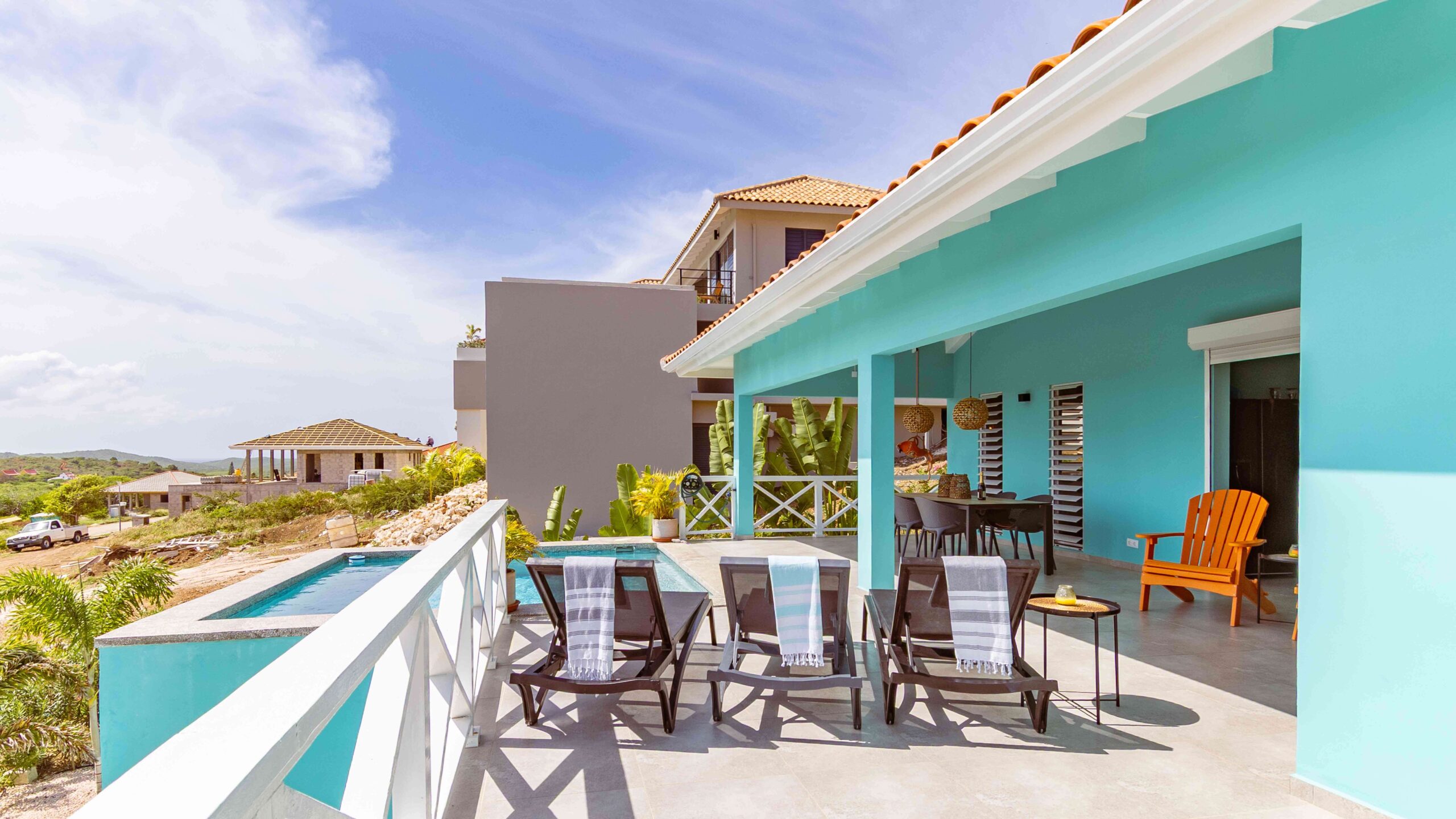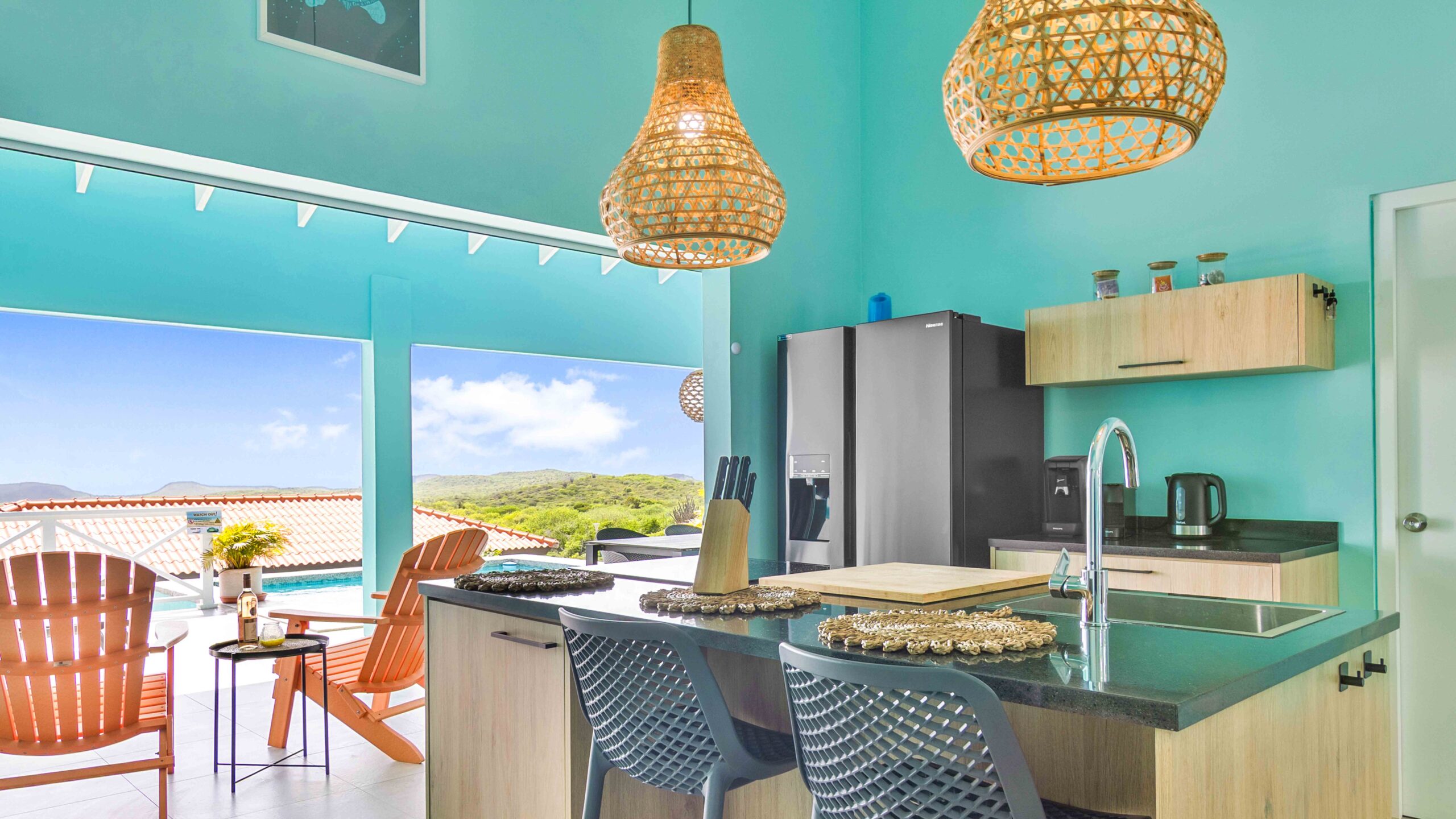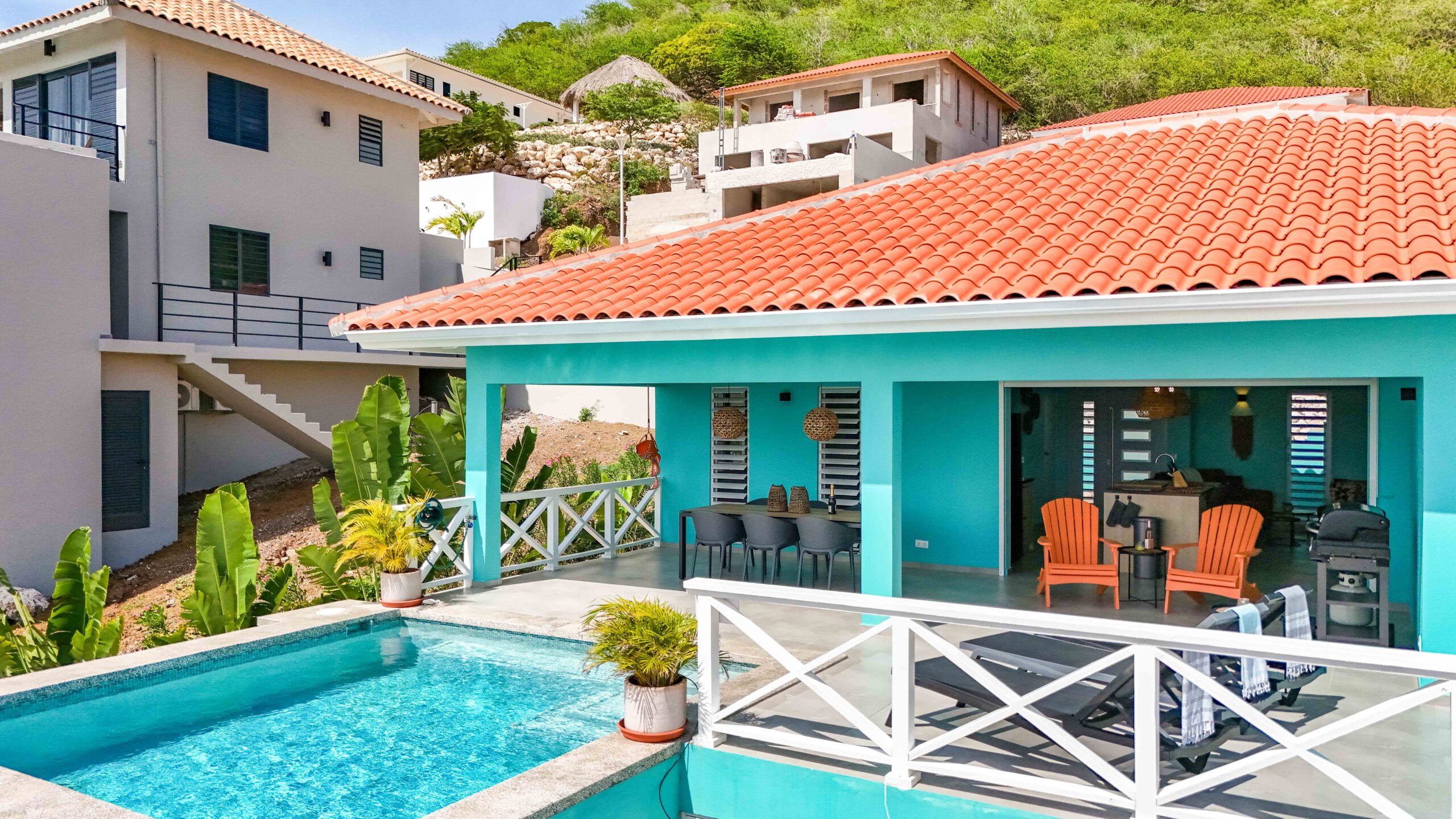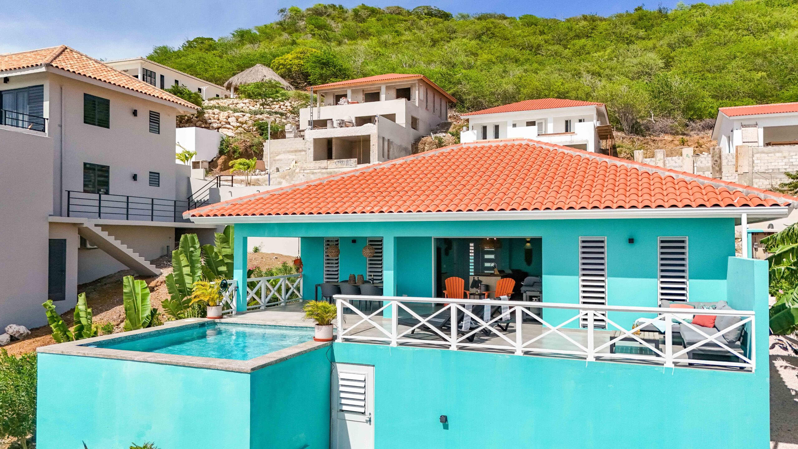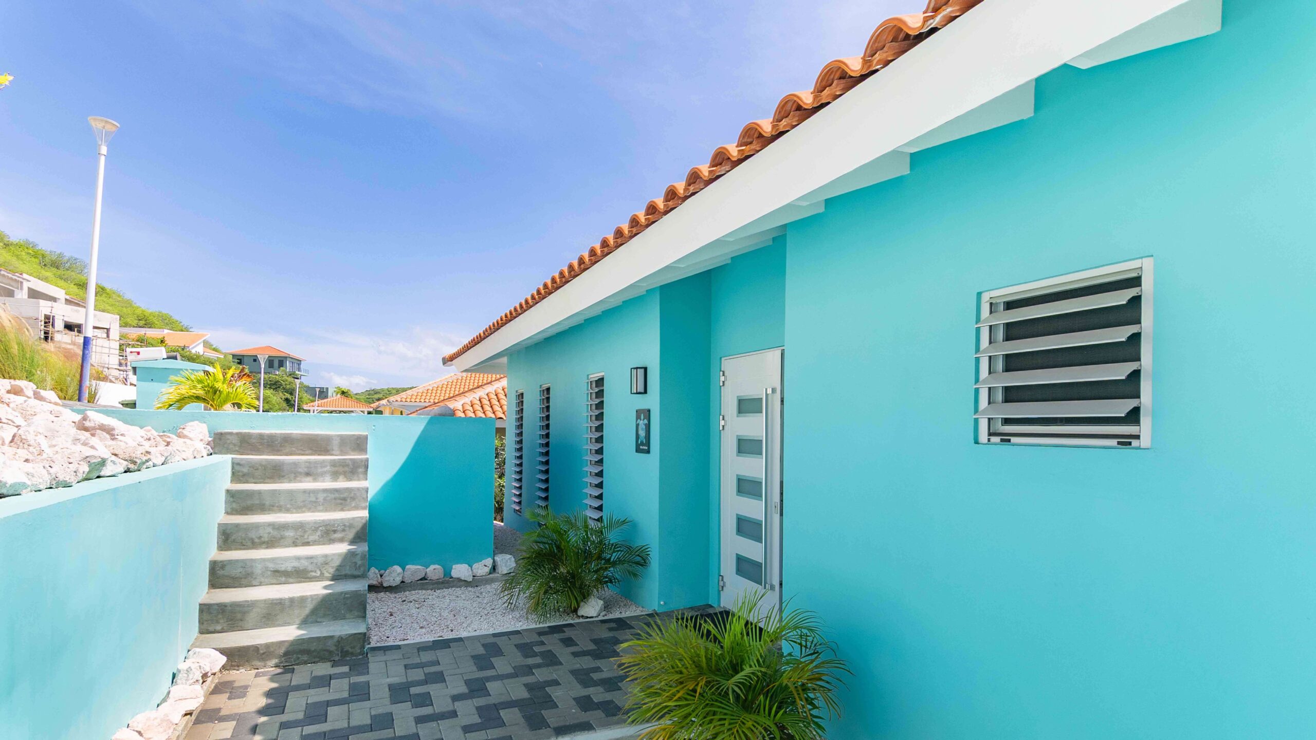 Deze luxe vakantiewoning, geschilderd in een frisse turquoise tint, biedt een onvergetelijk verblijf voor iedereen die wil genieten van comfort, natuur en de charme van het Caribische eiland Curaçao.