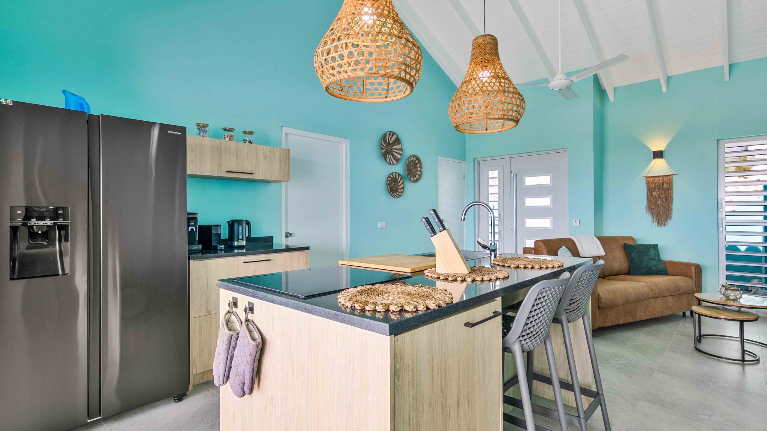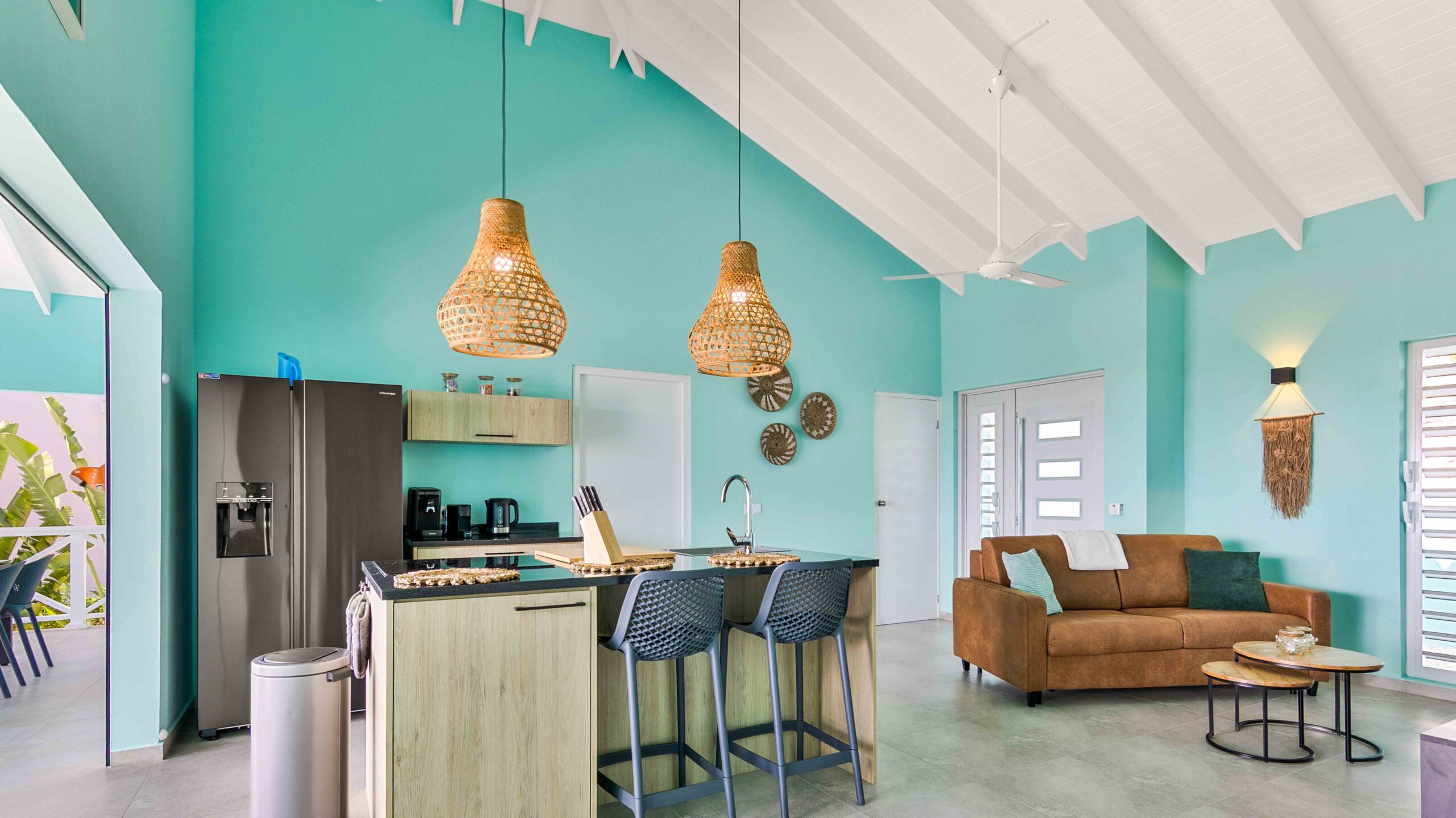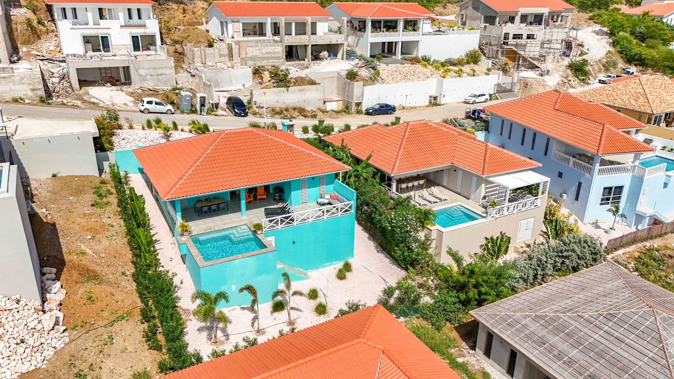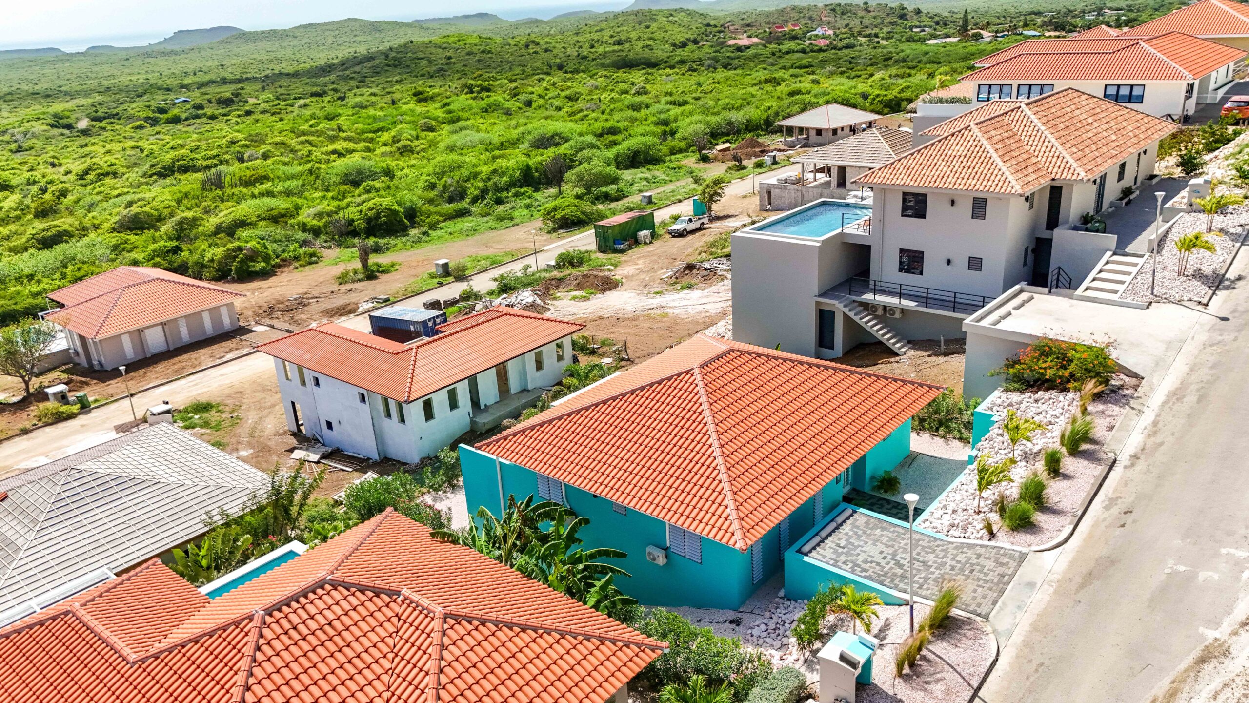 Deze luxe vakantiewoning, geschilderd in een frisse turquoise tint, biedt een onvergetelijk verblijf voor iedereen die wil genieten van comfort, natuur en de charme van het Caribische eiland Curaçao.