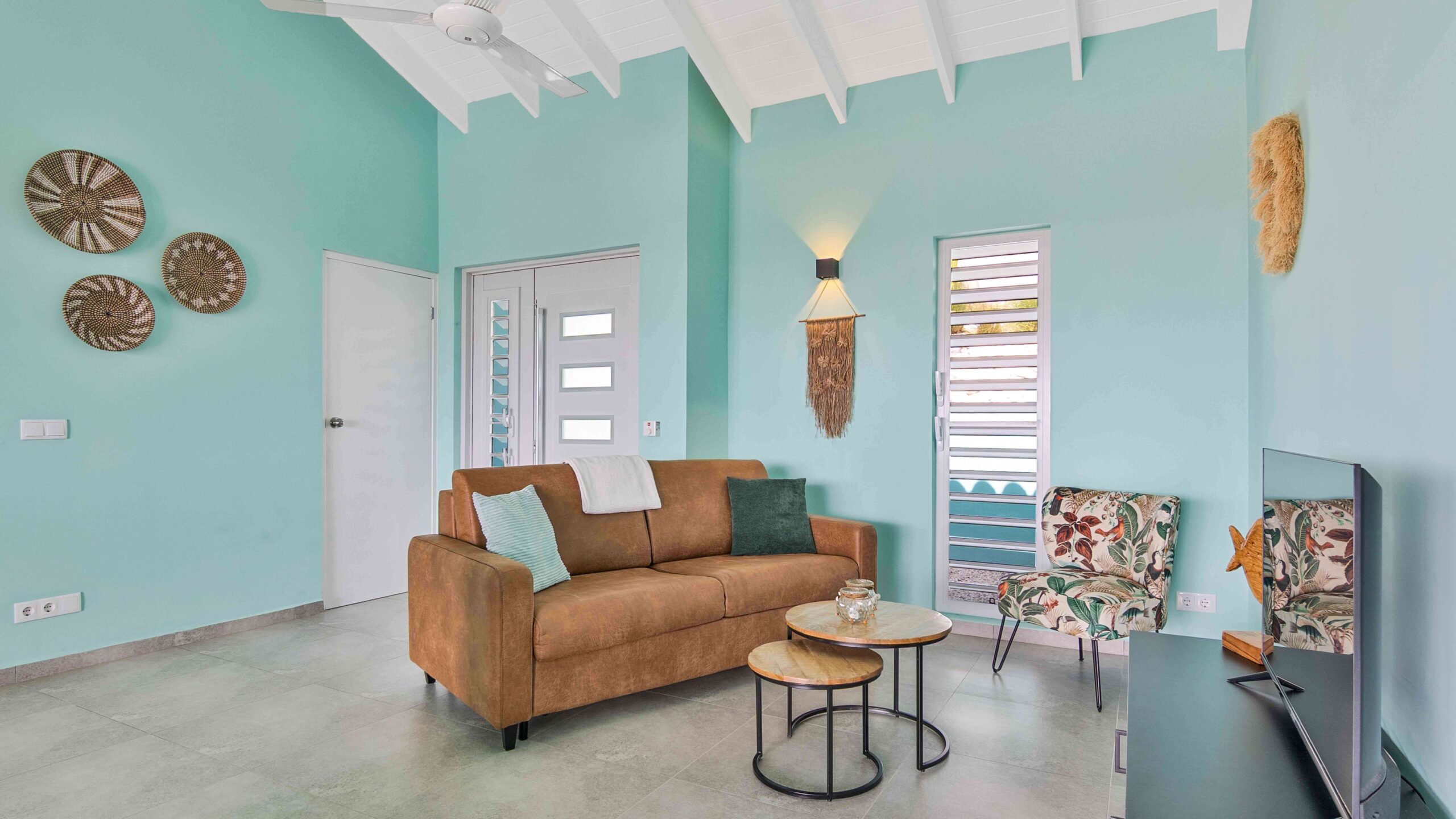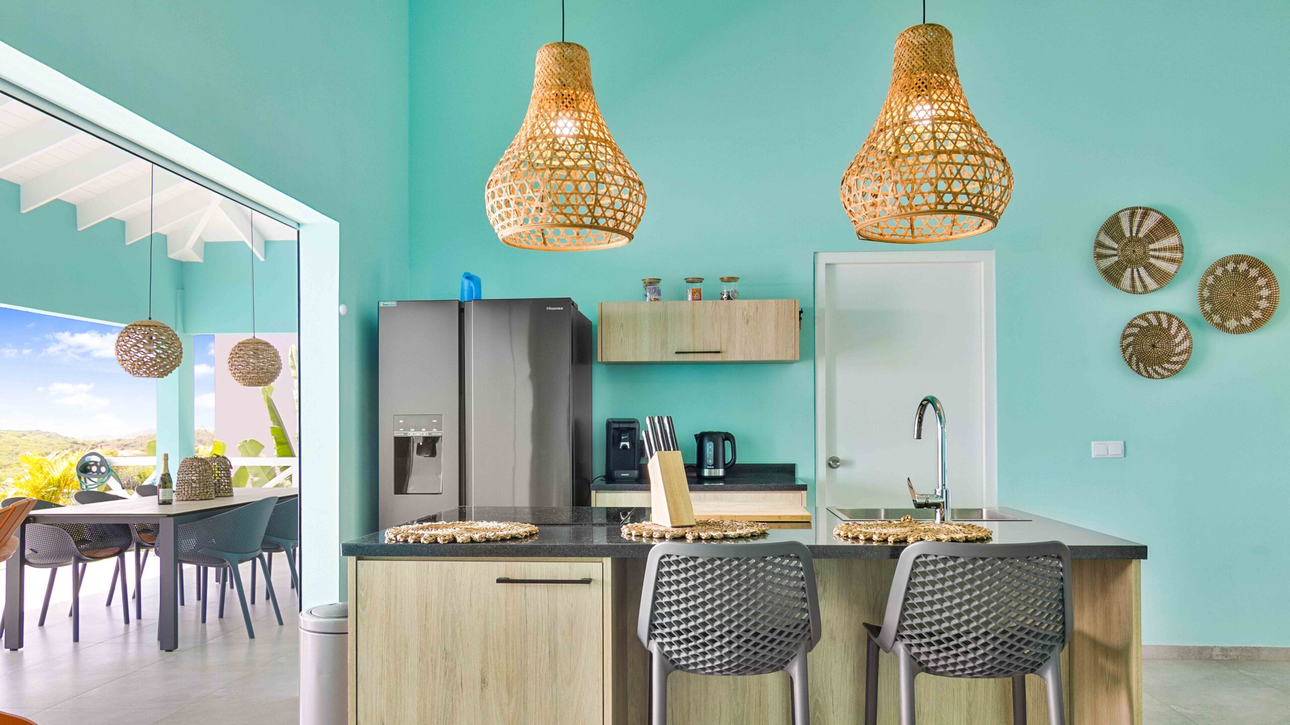 De volledig uitgeruste open keuken met kookeiland, inductiekookplaat, vaatwasser, magnetron/oven en Amerikaanse koelkast biedt alles wat je nodig hebt om heerlijke maaltijden te bereiden en er samen van te genieten. De gezellige woonkamer loopt naadloos over in het buitenterras, waar het echte vakantiegevoel begint. Op het terras vind je een gezellige eethoek, loungehoek, comfortabele “bear chairs”, ligbedden en een groot privézwembad van 4×4 meter. Geniet van indrukwekkende panoramische uitzichten over de Bandabou-heuvels en de Caribische Zee.